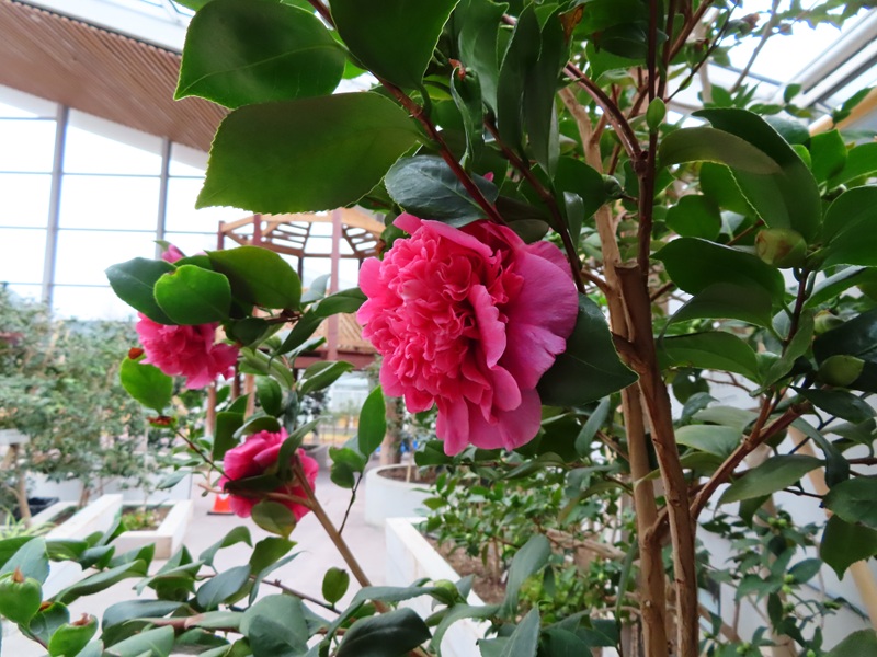 屋内つばき園でポルトガルのツバキ「ドナ・ヘルチリア・ドゥ・フライタス・マガラエス(Dona Herzilia de Freitas Magalhaes)」が三輪咲いています
