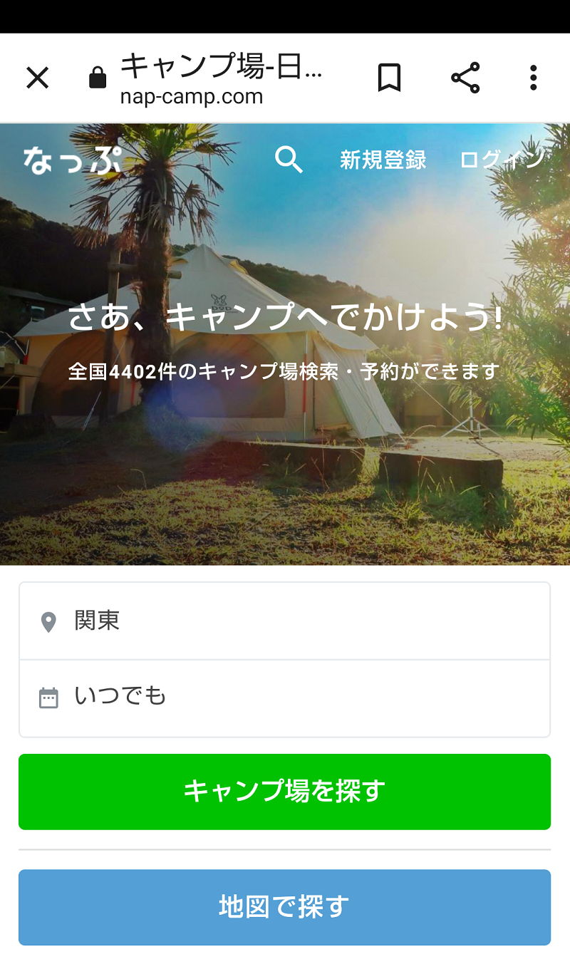 キャンプ場予約サイト「なっぷ」スマートフォンサイトからも登録できます。「新規登録」から登録をお願いします。