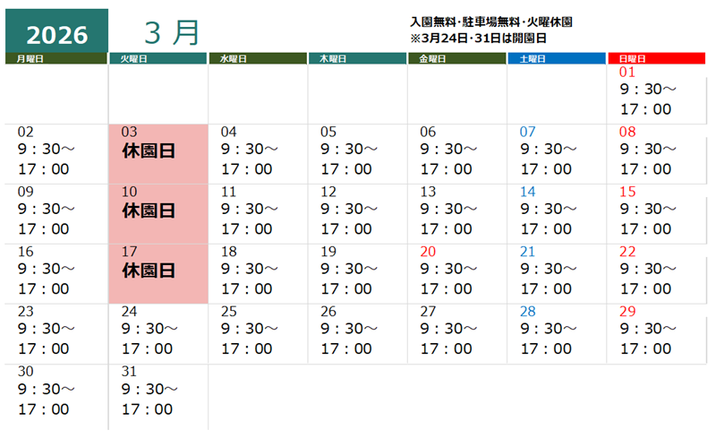 るるパーク(大分農業文化公園)12月~2月の開園時間は 10:00~16:00 入園無料・駐車場無料休園日は毎週火曜日です。